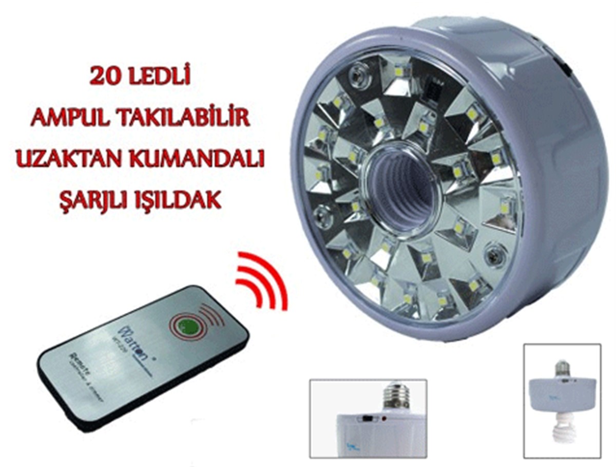 20 Ledli Ampul Takılabilir Uzaktan Kumandalı Şarjlı Işıldak