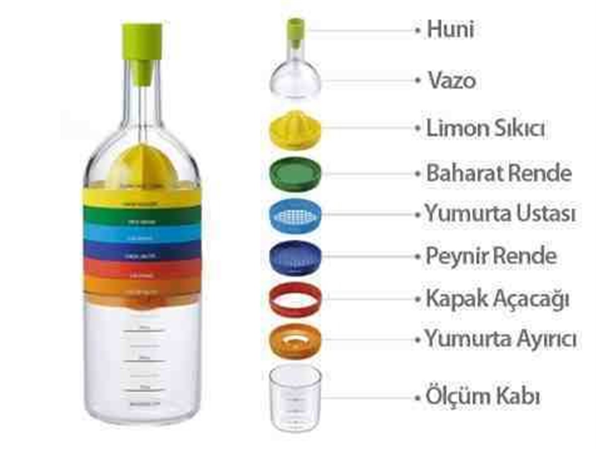 Tam sekiz farklı mutfak aletinin yapacağı işi tek başına yapacak. Yumurta Ayracı, Peynir Rendeleyici, Kavanoz Açıcı, Baharat Öğütücü, Limon Sıkacağı, Huni, Yumurta Dilimleyici ve Ölçüm Haznesi olarak kullanılabilen sekiz fonksiyonlu, renkli ve şık görünümlü mutfak yardımcınız emrinizde!