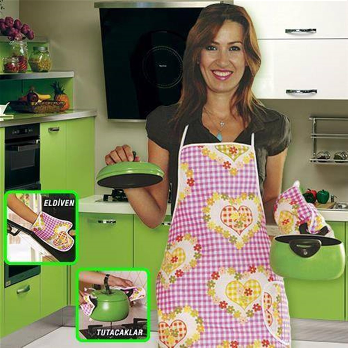 Önlük, eldiven ve tutacaklar ile mutfakta ki en büyük yardımcılarınız bu sette.